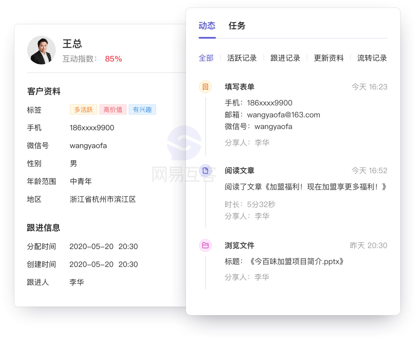 市面上有很多客户关系管理系统(CRM),可以帮公司“保管”客户资料。比如网易互客SCRM可以记录客户所有资料信息,不用担心员工离职拷走或者恶意删除记录在Excel的公司客户资料。